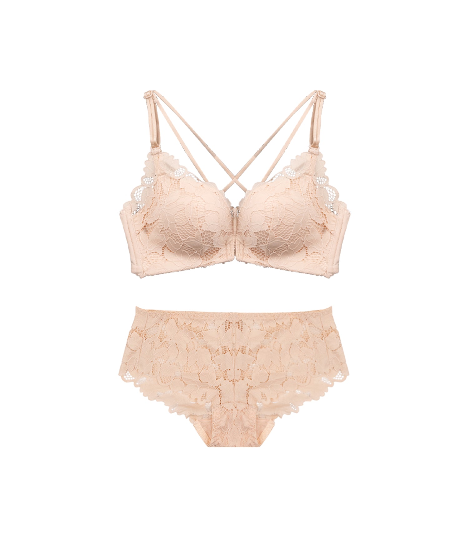 Deep Cleavage Front Buckle Flora Crossed Beauty Back Wireless Bra Set Apricot