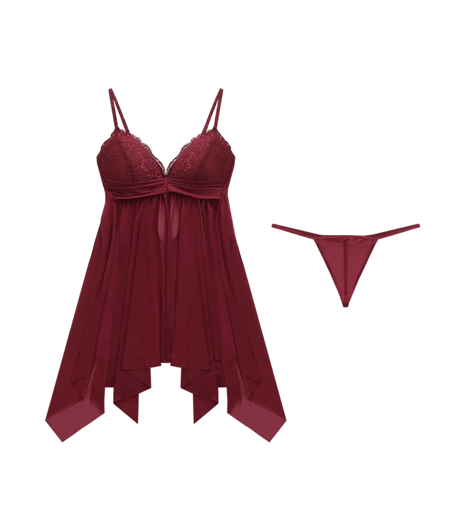 Irregular Hem Transparent Lace Wireless Pajamas Set Claret