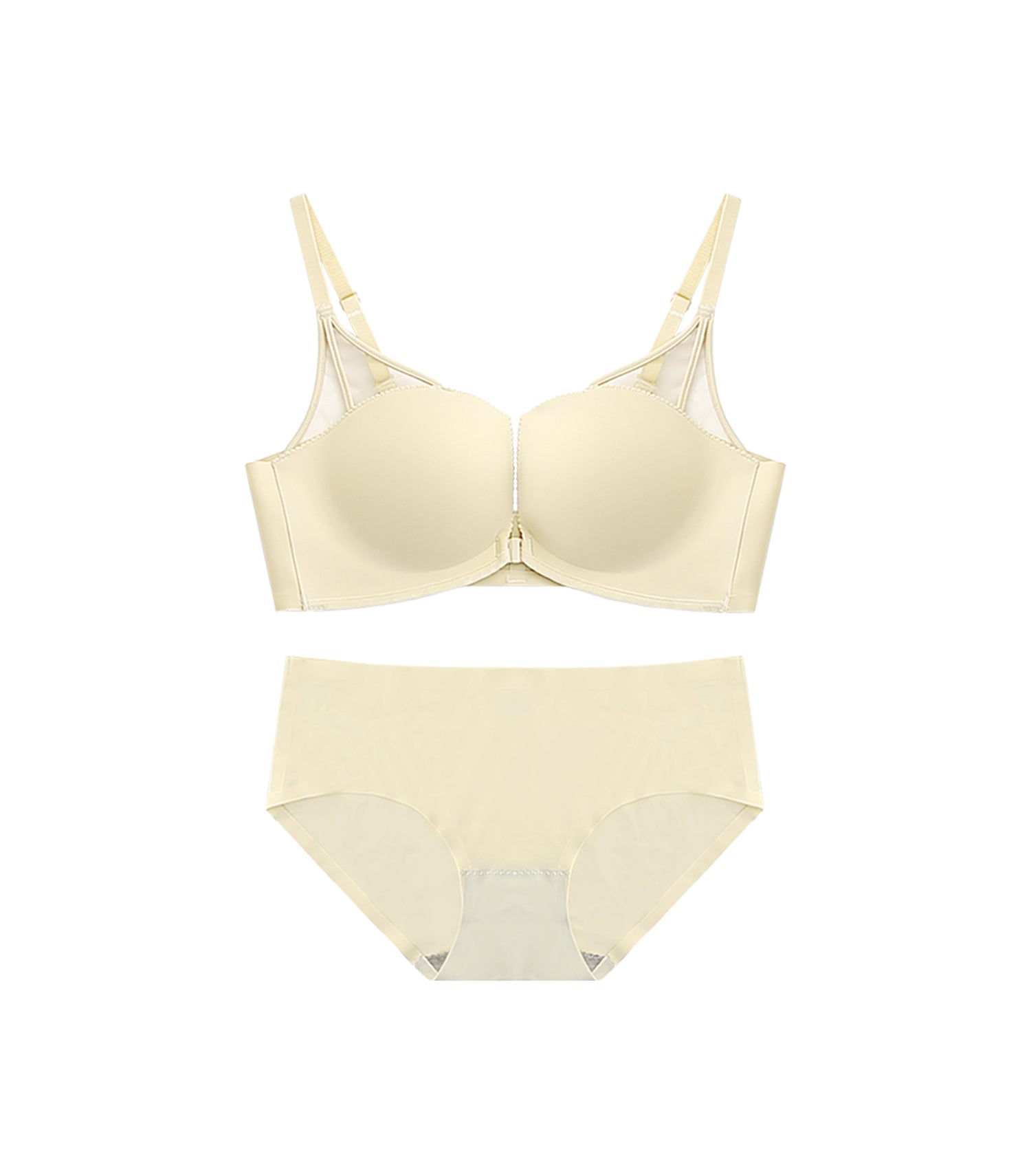 Deep Cleavage Front Buckle Seamless Mesh Wireless Bra Set Beige