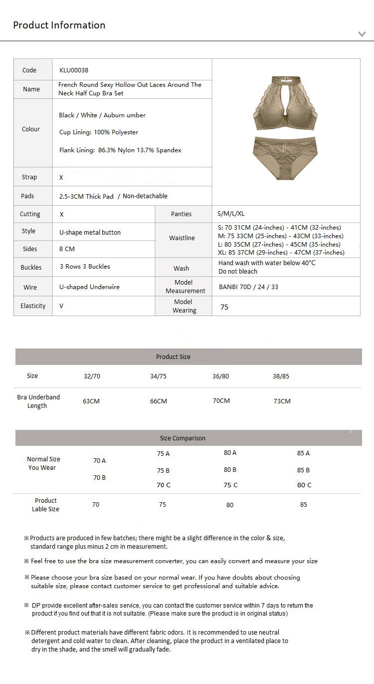 French Round Sexy Hollow Out Laces Around The Neck Half Cup Bra Set Auburn umber