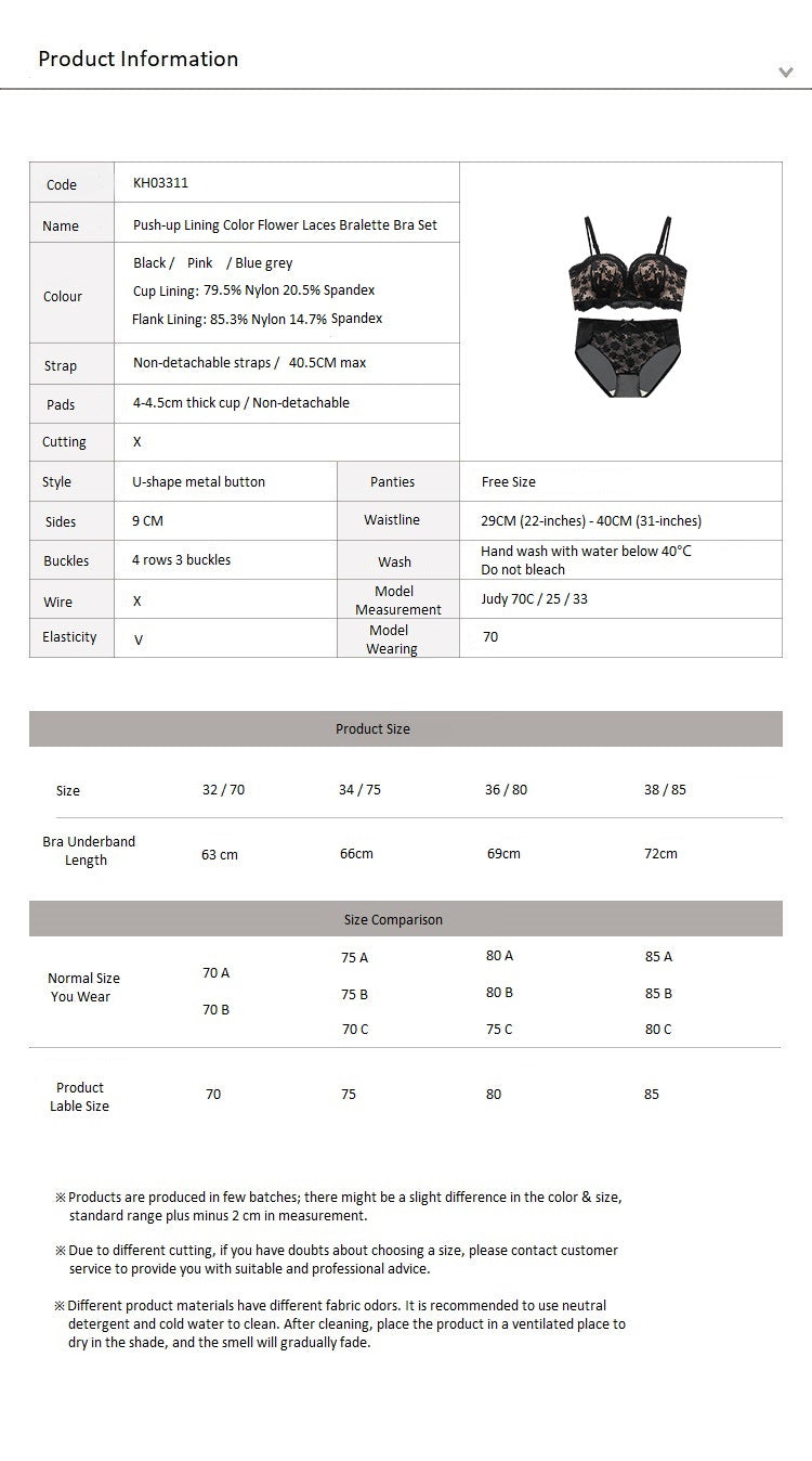 Push-up Lining Color Flower Laces Bralette Bra Set Black