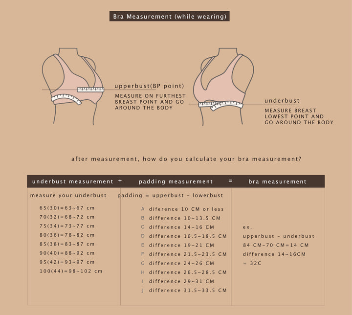 Your underwear size will be measured, please wear underwired underwear to measure.