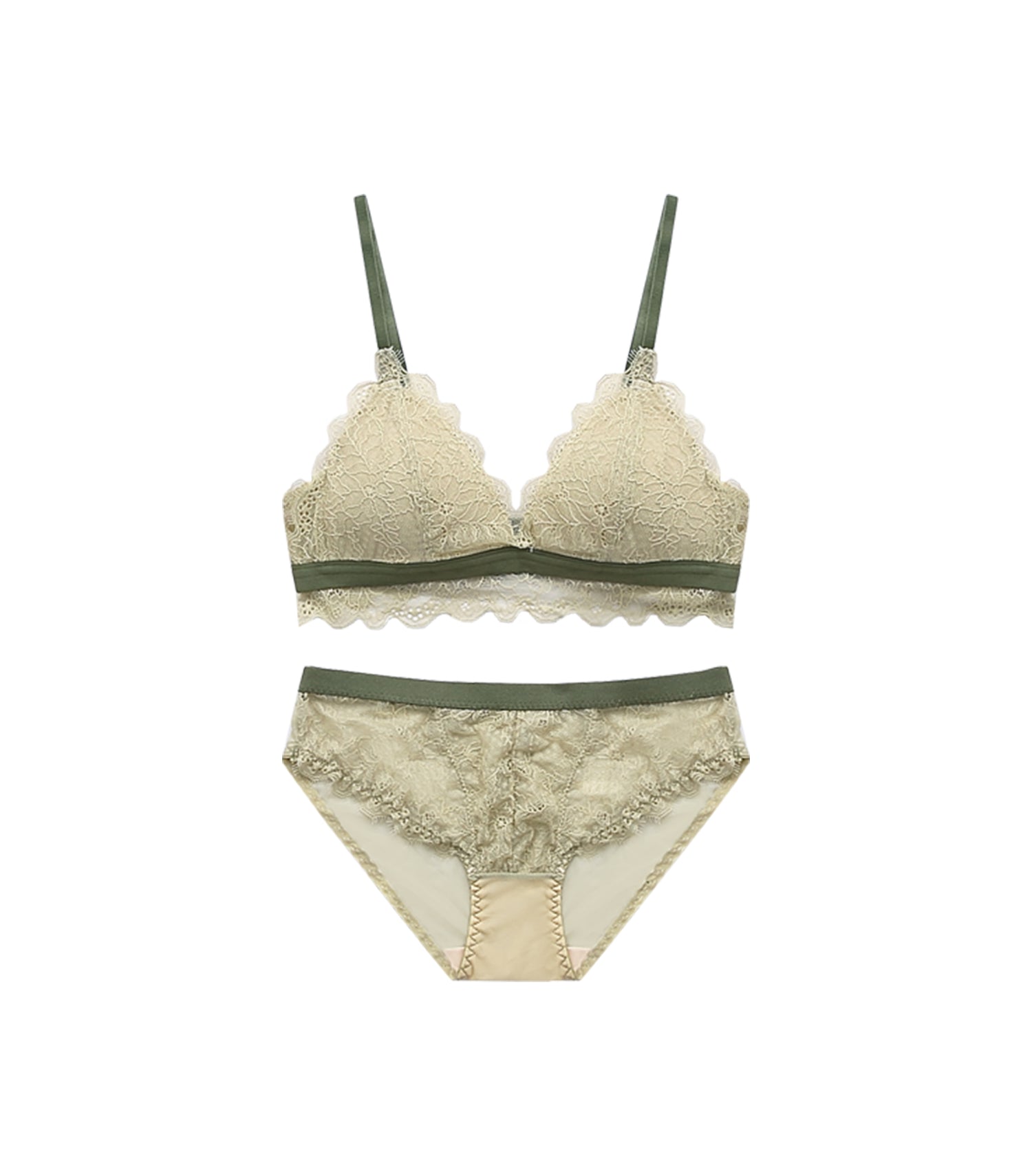 Low Gore Laces Color Matching Beauty Triangular Cup Wireless Bra Set Green